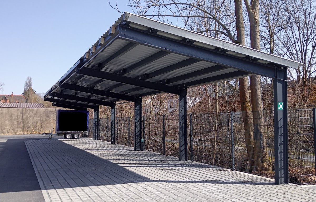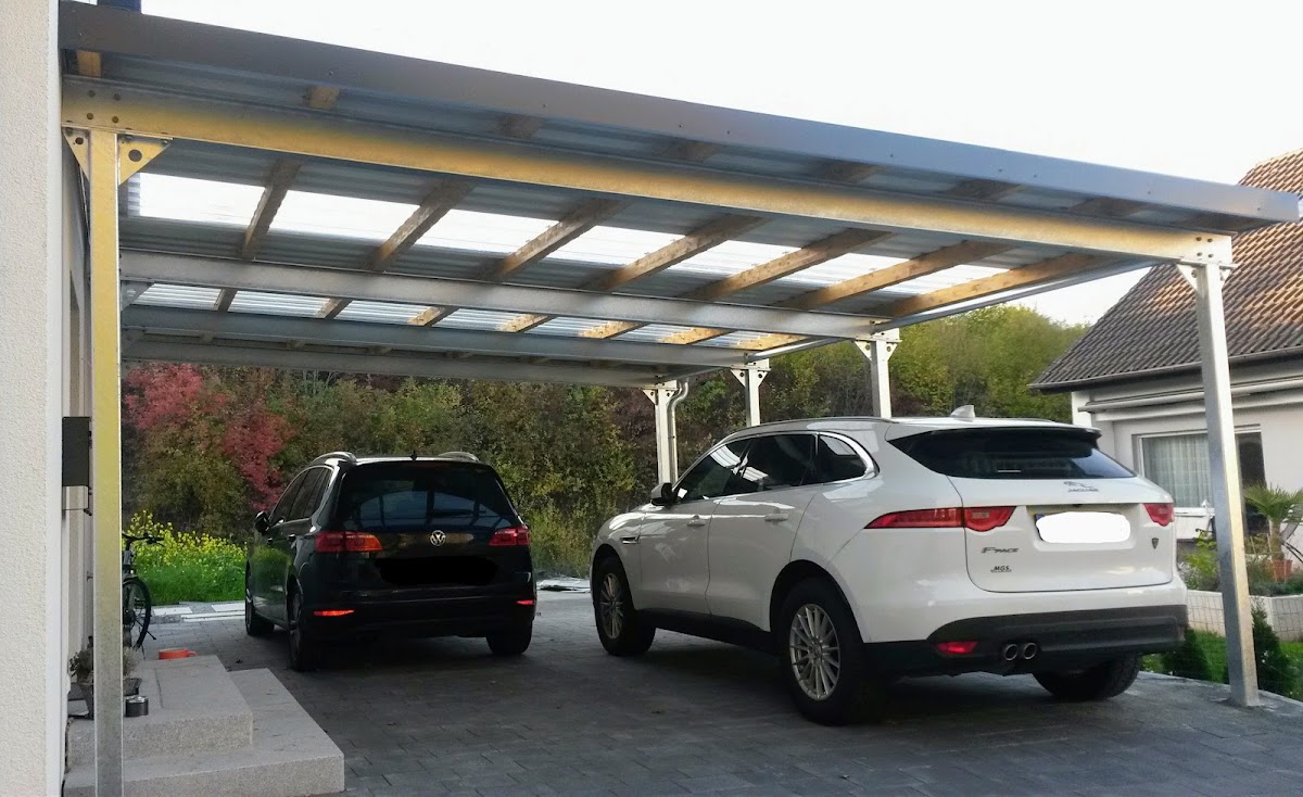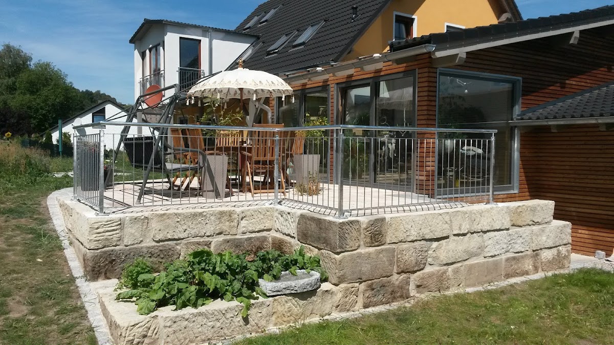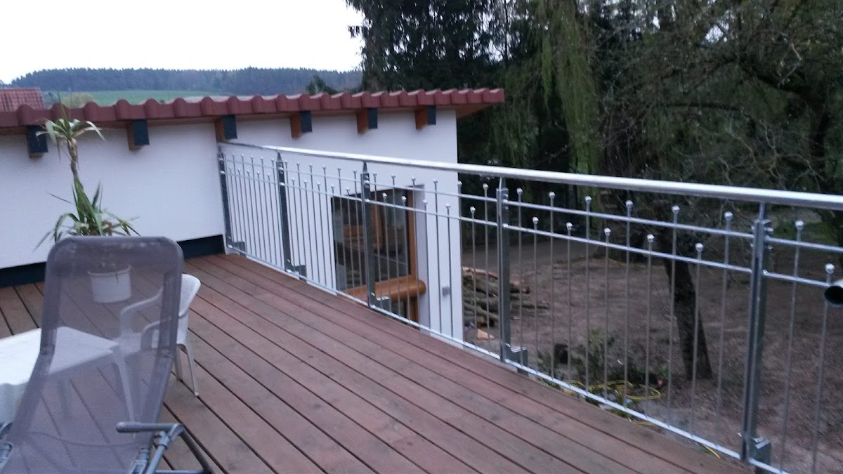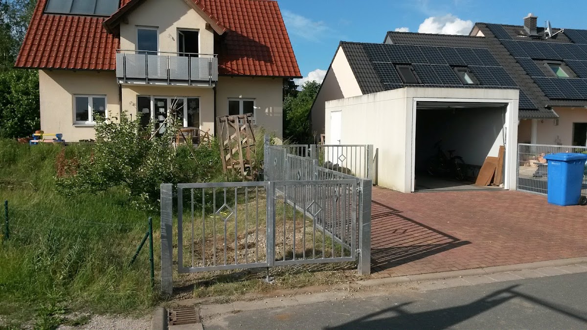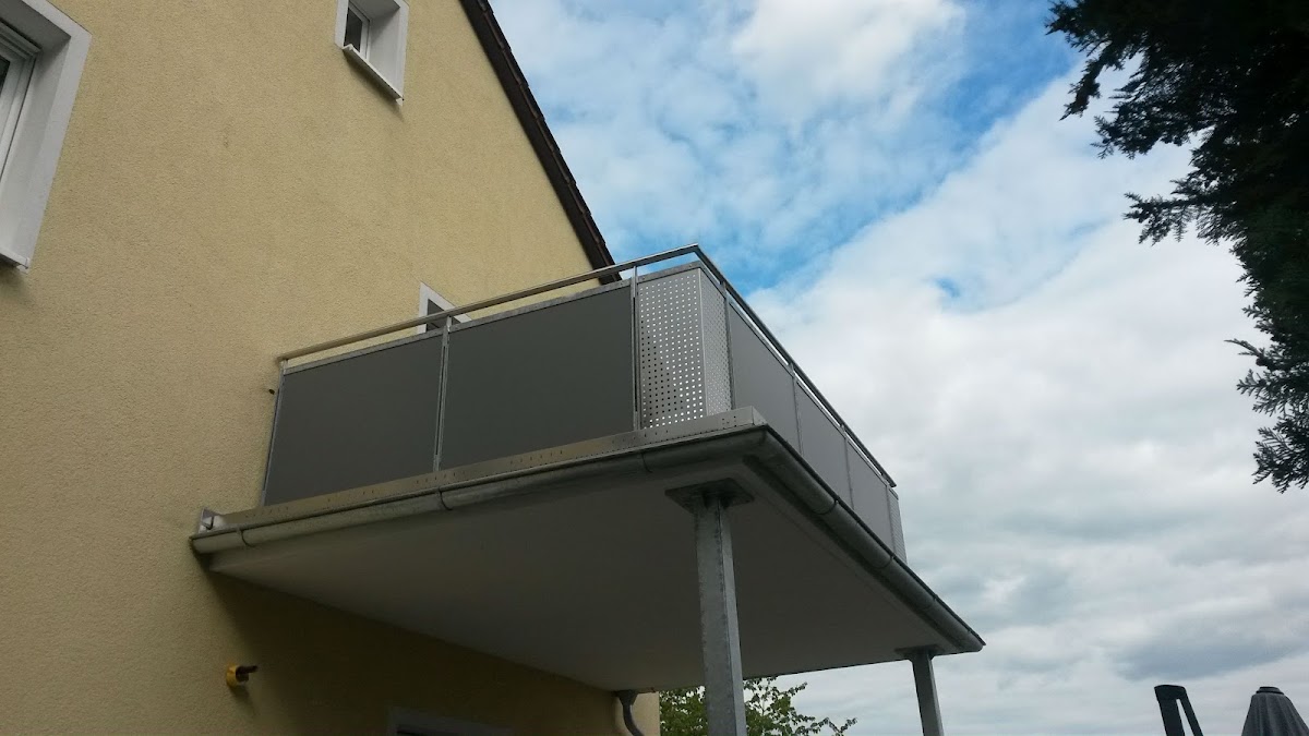 Das Vordach am Hauseingang past einfach perfekt. Optisch wie funktional. Sehr massiv, dennoch vom Aussehen her nicht erschlagend. Die beiden Geländerstangen sind im Nu abmontiert, wenn bei Ein- oder Auszug der Mieter etwas sperrige Möbel ums Eck müssen.