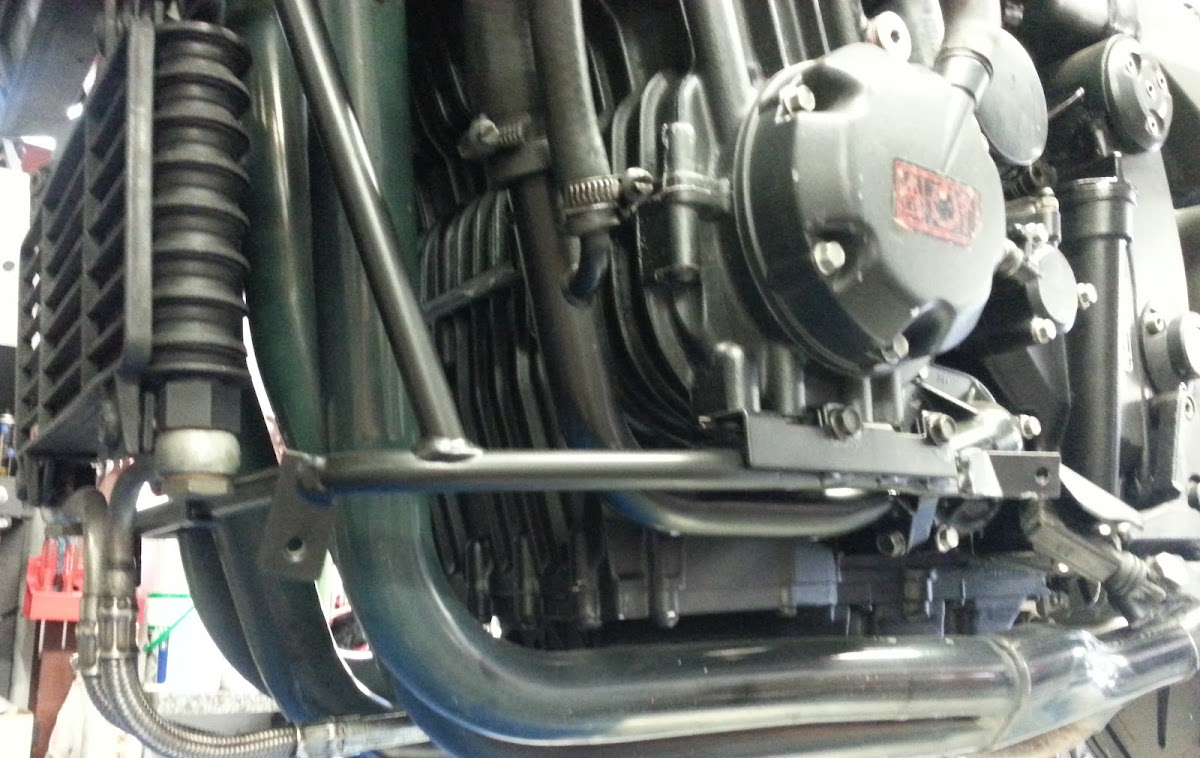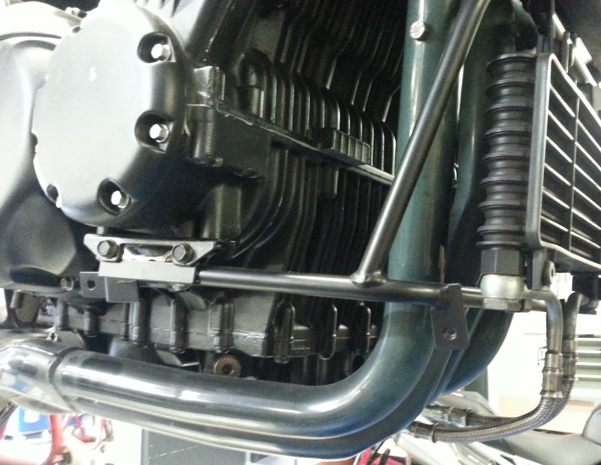 Beim letzte Projekt wurde der Ölkühlerhalter verlängert (durch einsetzten gedrehter Hülsen in das Rohrgestänge) und es ist nichts davon zu erkennen, dass dieser Halter verändert wurde.