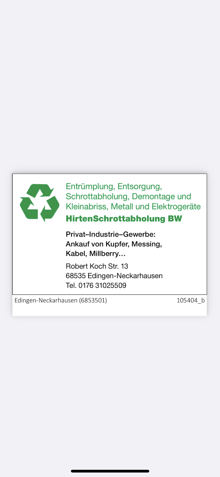 Ich habe heute bei HirtenSchrottabholung-Metall und Elektrogeräte/Entsorgung angerufen. Ich hatte einen alten, recht großen, Gasgrill zu entsorgen. Der Mitarbeiter am Telefon (Herr Coban) war sehr nett, hat angeboten innerhalb einer Stunde den Gasgrill in Edingen abzuholen. Ich war sehr überrascht, wie schnell alles ging. Er hat Wort gehalten, kam und hat das Gerät abgeholt. Alles lief schnell und professionell. Daher kann ich die Fa. guten Gewissens weiter empfehlen. Volle Sterne Zahl!
