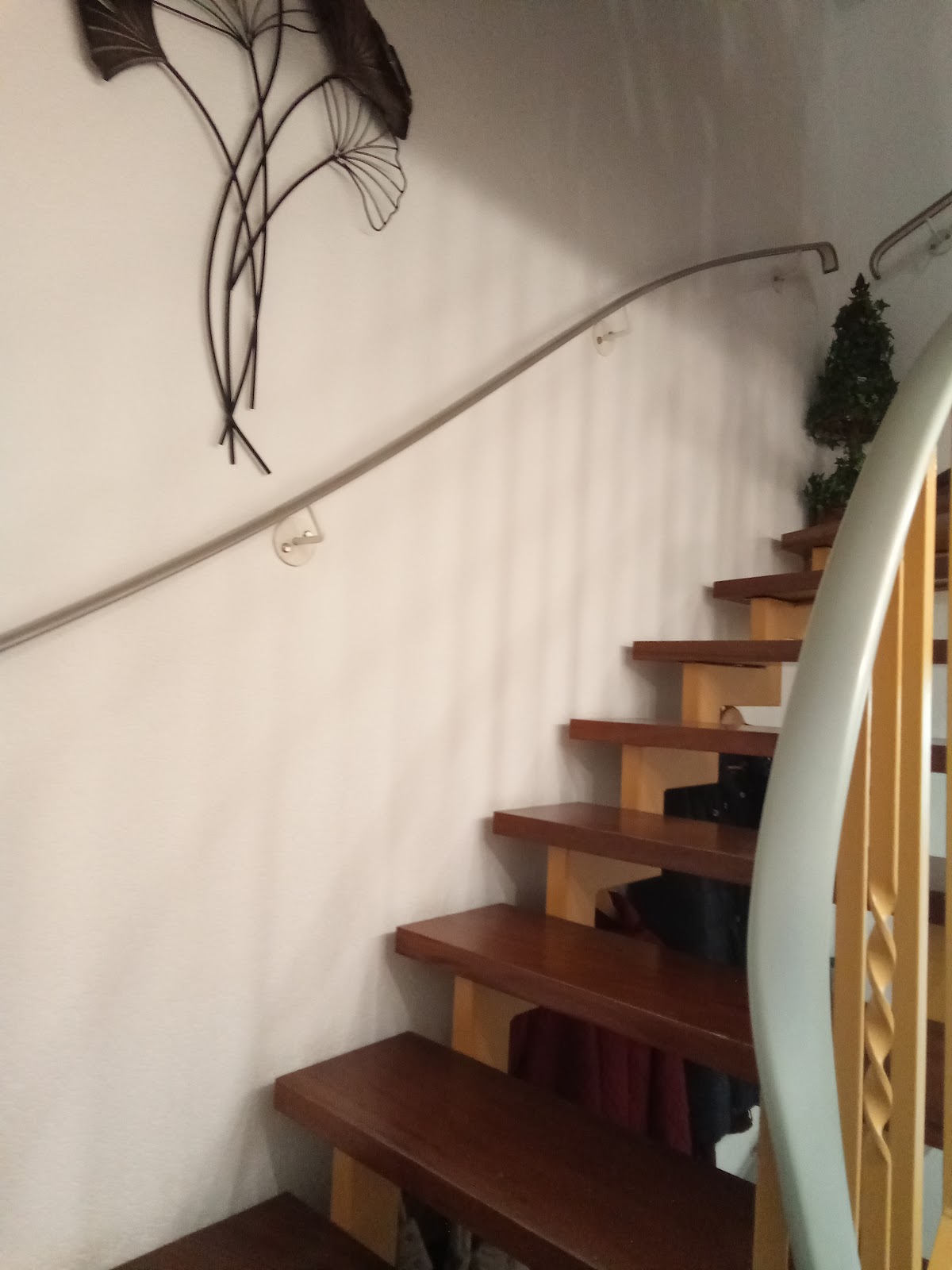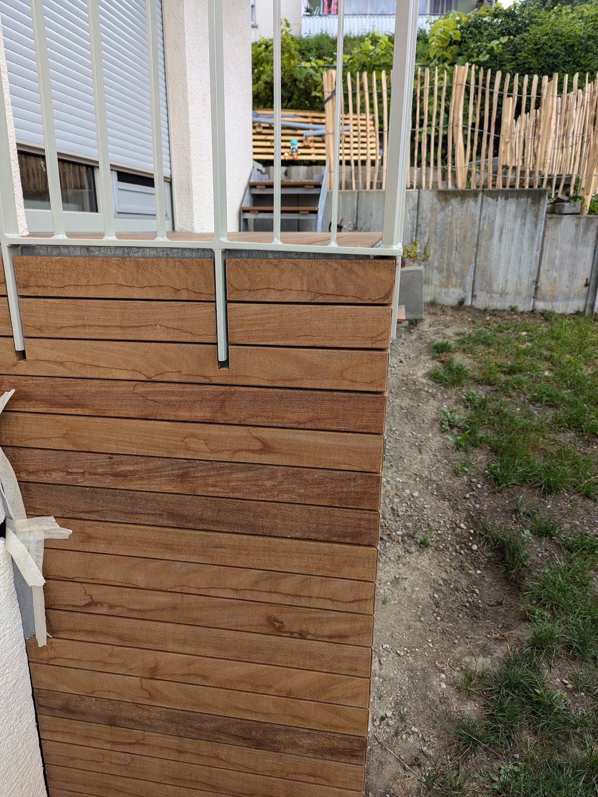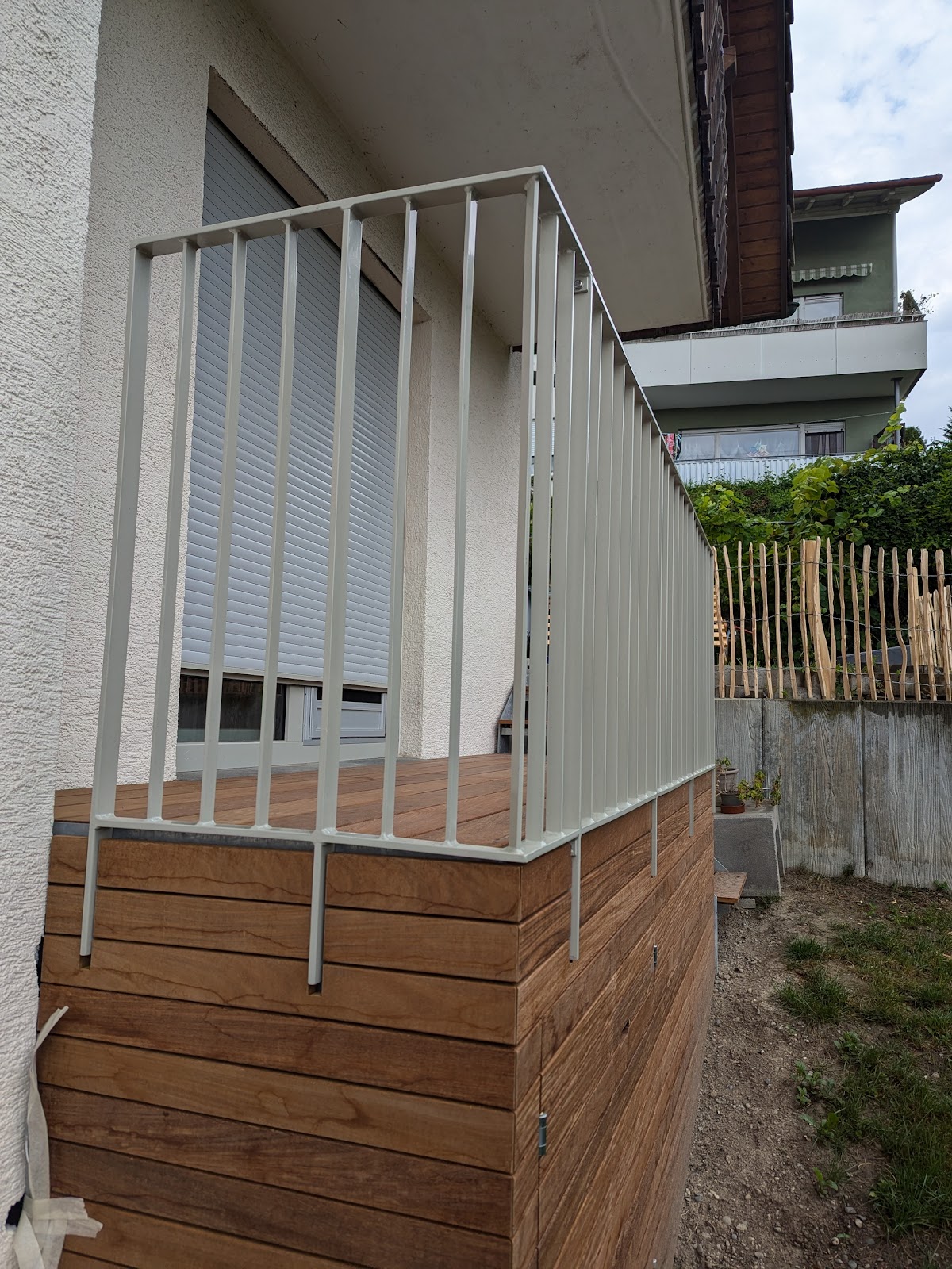 Zu unserem Ärger ist die ausgeführte Arbeit zudem unsauber. Zwar wurden einige Mängel, wie die verbogenen Geländerstäbe, die überstehenden scharfen Spitzen der Lackierung sowie die überstehenden Stahlkanten der Balkontreppe, nachträglich etwas korrigiert und die lockeren Muttern auf Aufforderung nachgezogen, doch das Endergebnis bleibt unbefriedigend: Das Geländer ist schief (wie auf dem Foto zu sehen) und die Verarbeitung insgesamt mangelhaft.