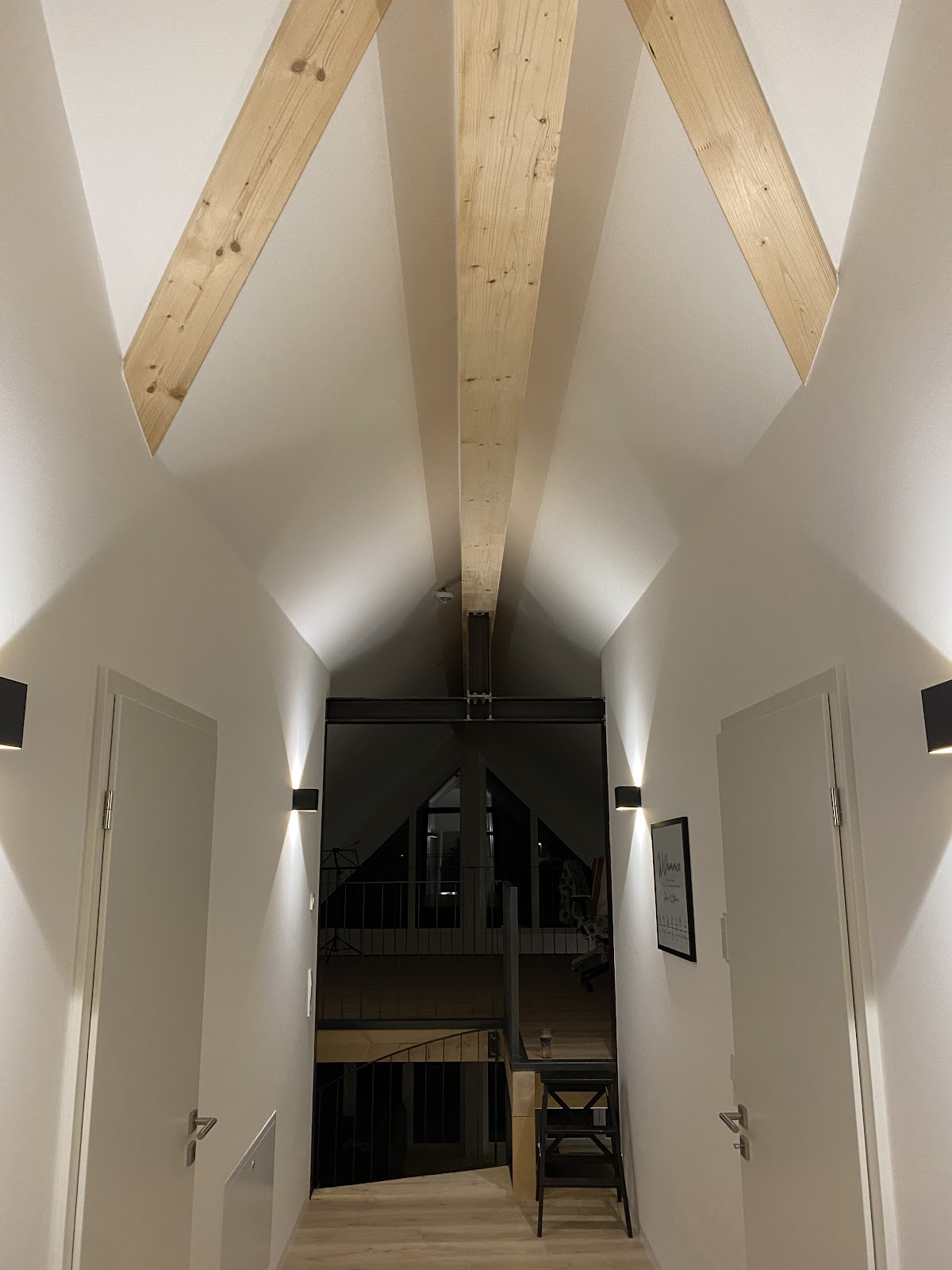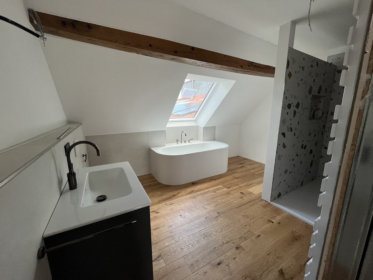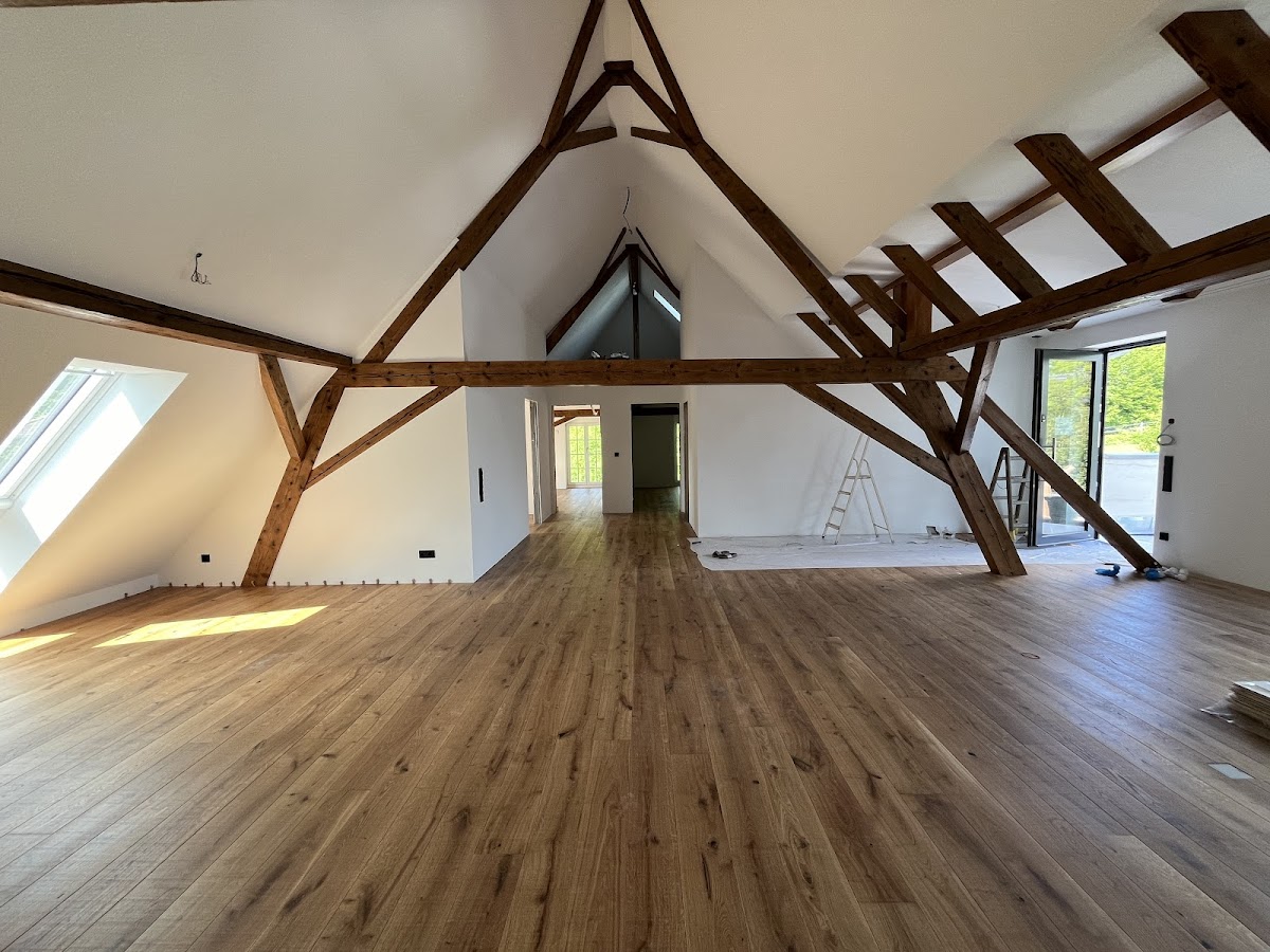 Das Team hat eine einwandfreie Arbeit abgeliefert und unsere unendlich Decken und Wand Flächen sauber und in Perfektion bearbeitet. Größten Respekt dass die Dachschrägen so gut und ohne jegliche Streifen gelungen sind. Die Anschlüsse an das Sichtgebälk, die Wandbündigen Sockelleisten und die Fliesen sind sauber abgeschlossen.