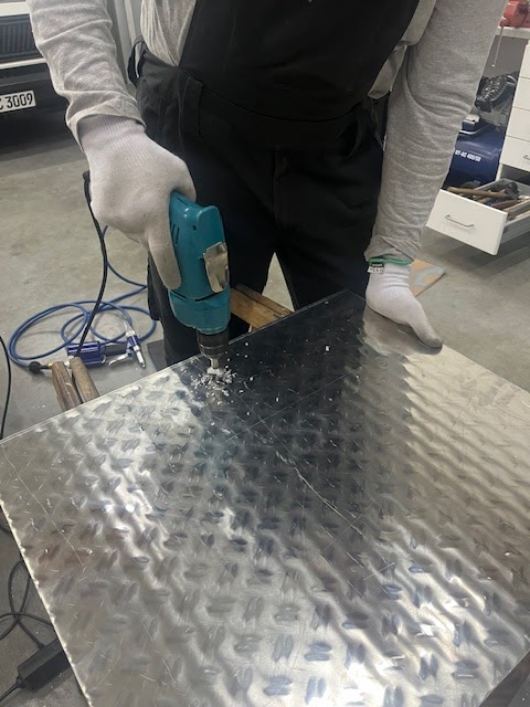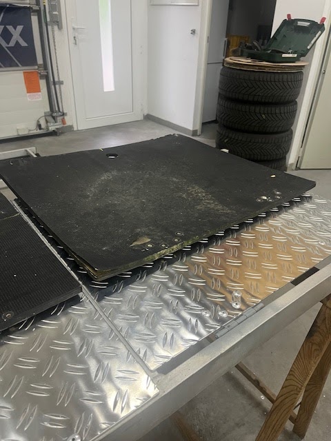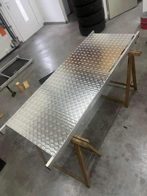 Die Bretter meines Rollgerüstes waren bereits nach einem Jahr wieder durchgegammelt und habe jetzt 3,5 mm ALU-Riffelblech eingenietet, da brauch ich so schnell nicht mehr bei*
